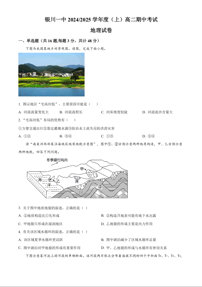 宁夏回族自治区银川一中2024-2025学年度(上)高二期中考试地理+答案