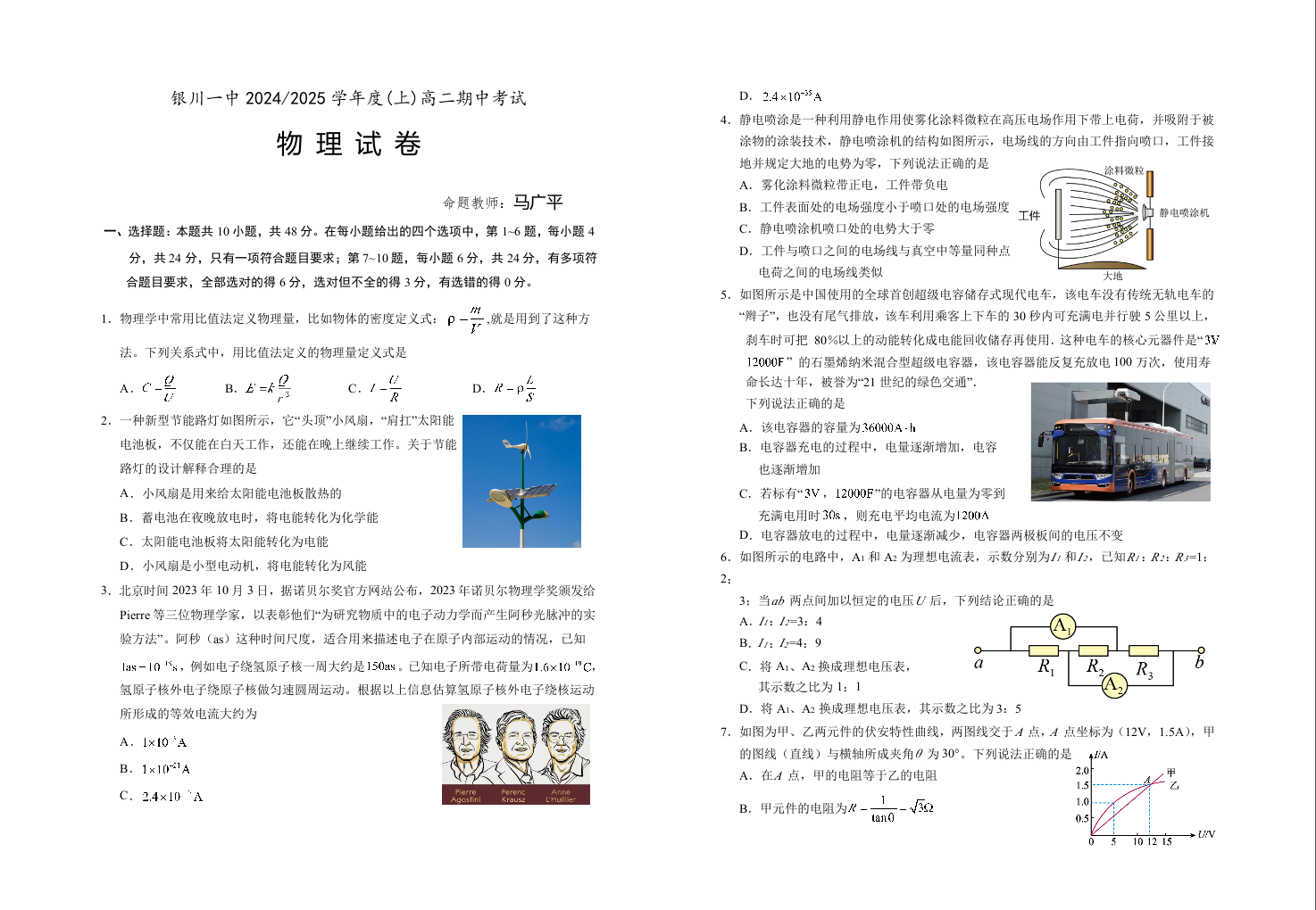 宁夏回族自治区银川一中2024-2025学年度(上)高二期中考试物理+答案