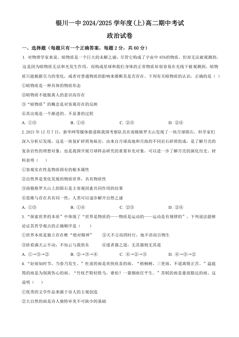 宁夏回族自治区银川一中2024-2025学年度(上)高二期中考试政治+答案