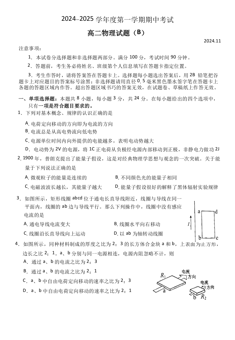 山东省菏泽市2024-2025学年度第一学期期中考试物理B