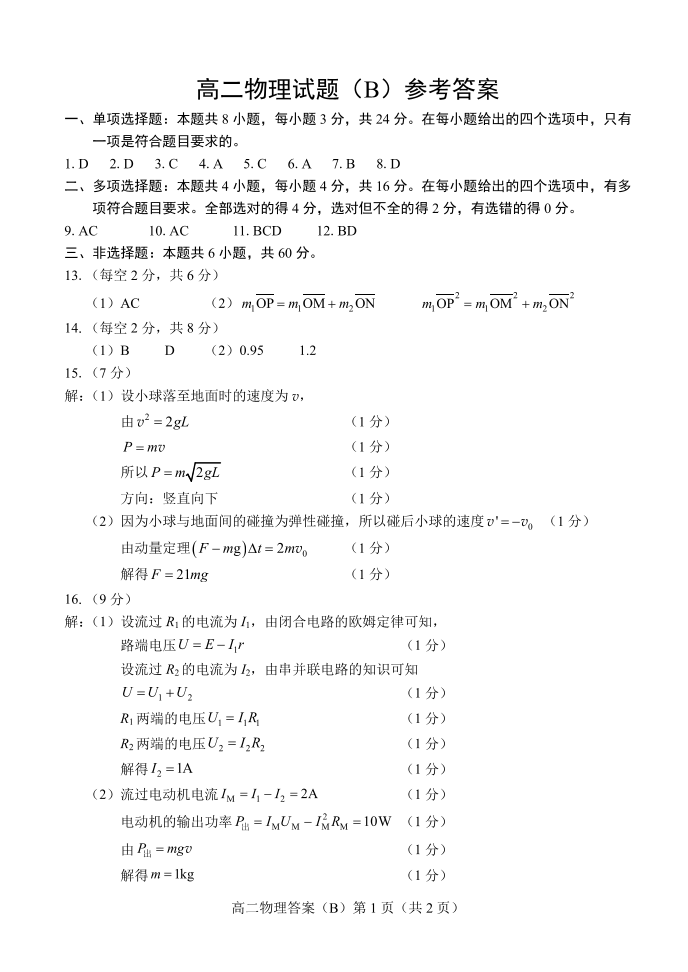 山东省菏泽市2024-2025学年度第一学期期中考试物理答案B