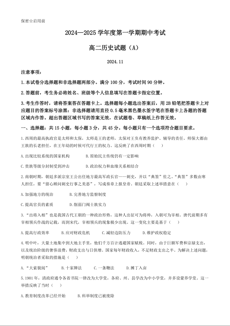 山东省菏泽市2024-2025学年度第一学期期中考试历史A+答案