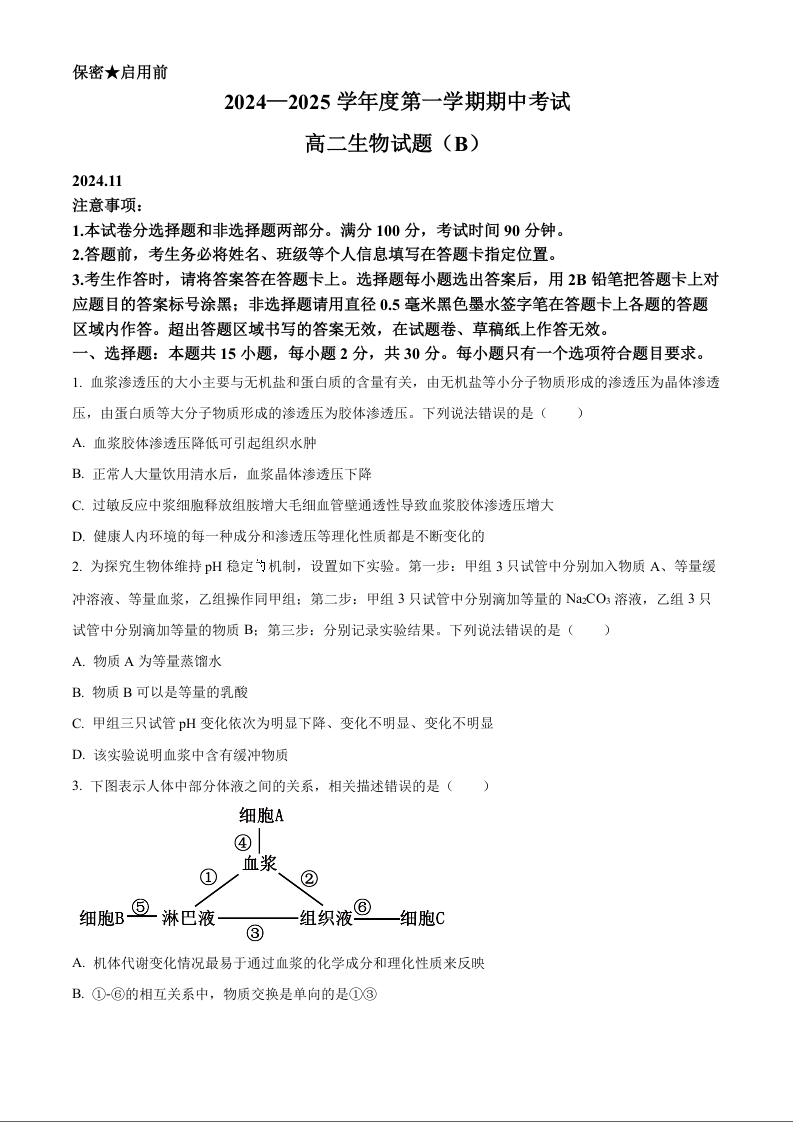 山东省菏泽市2024-2025学年度第一学期期中考试生物B+答案