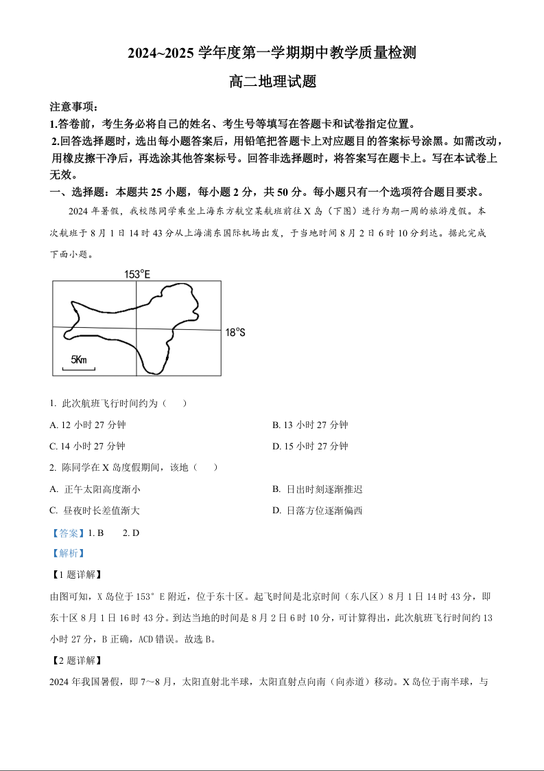 山东省聊城市2024-2025学年度第一学期期中教学质量检测地理+答案