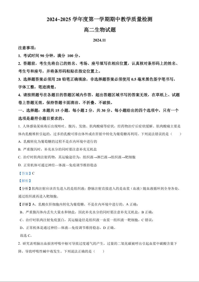 山东省聊城市2024-2025学年度第一学期期中教学质量检测生物+答案