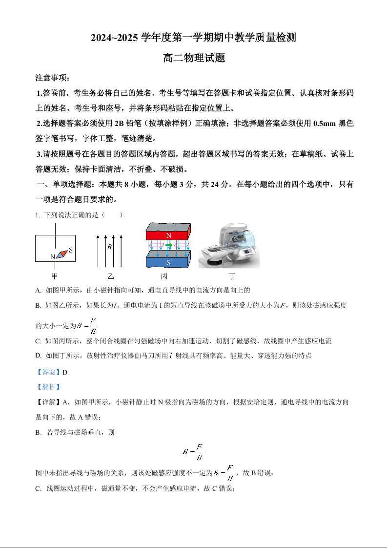 山东省聊城市2024-2025学年度第一学期期中教学质量检测物理+答案