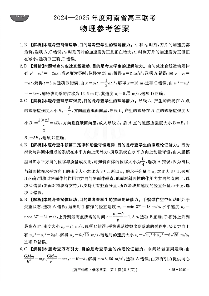 河南省部分高中2025届高三年级上学期12月联考物理答案