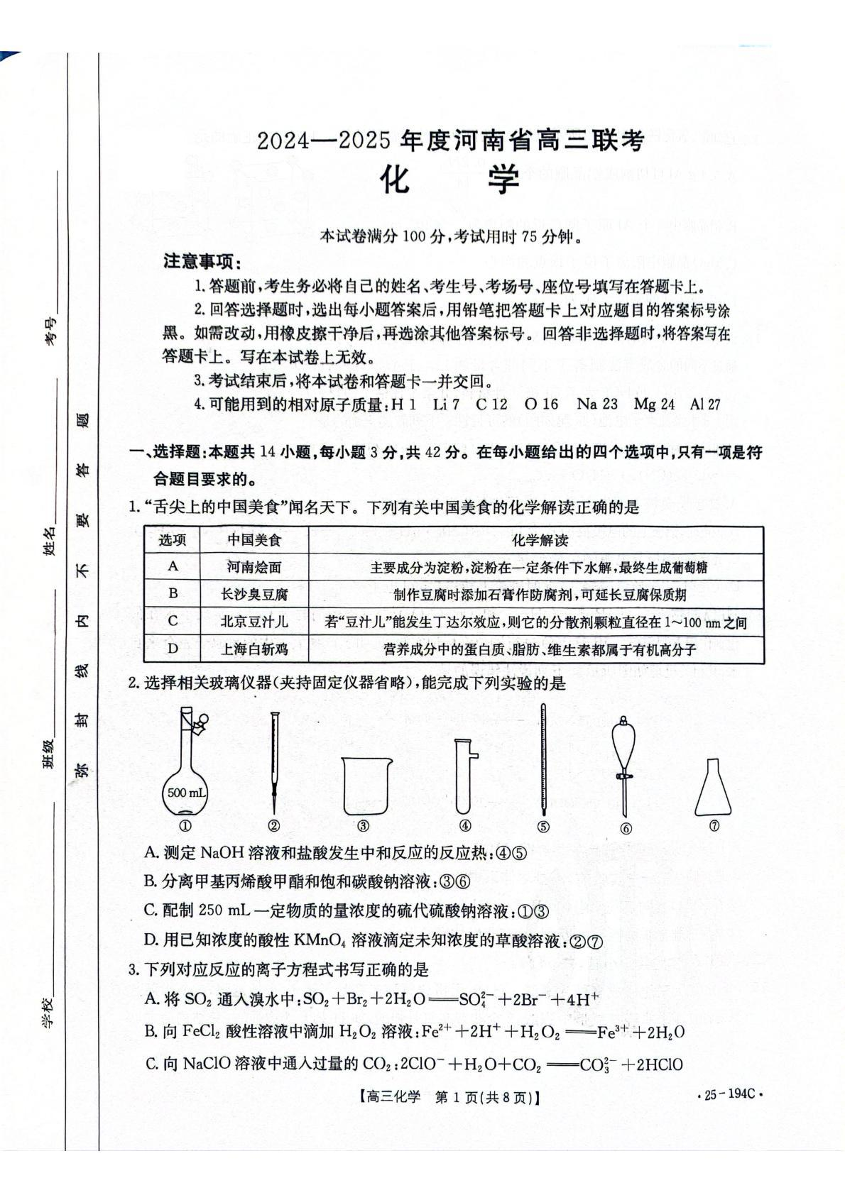 河南省部分高中2025届高三年级上学期12月联考化学+答案