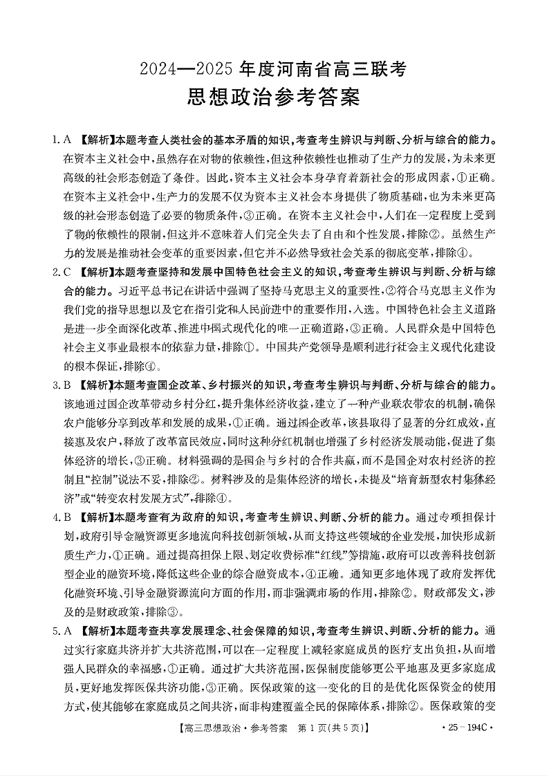 河南省部分高中2025届高三年级上学期12月联考政治答案