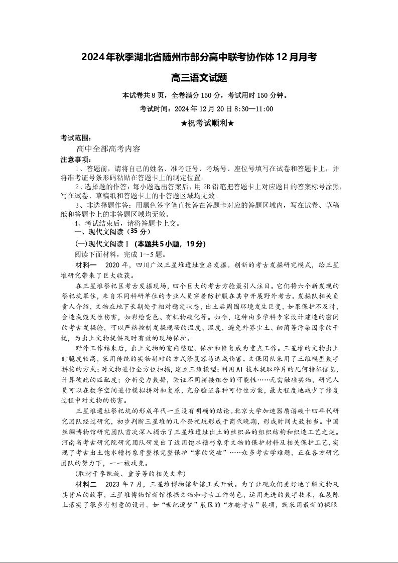 湖北省随州市部分高中联考协作体2025届高三上学期12月联考语文