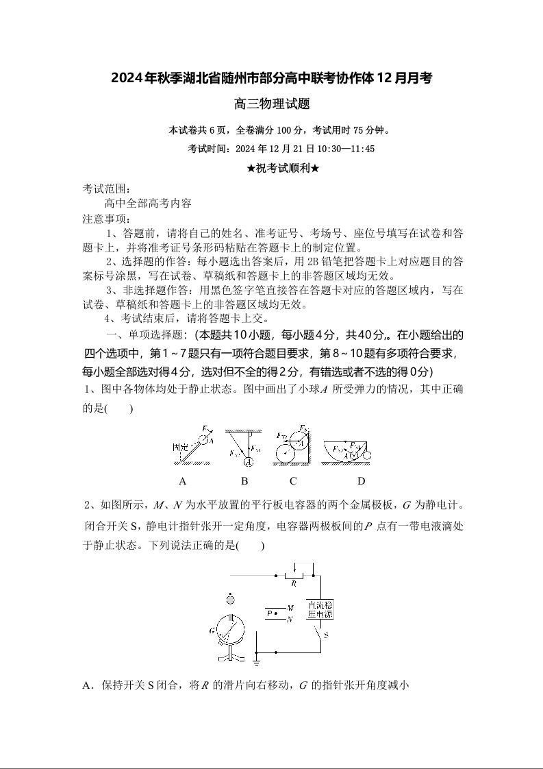 湖北省随州市部分高中联考协作体2025届高三上学期12月联考物理