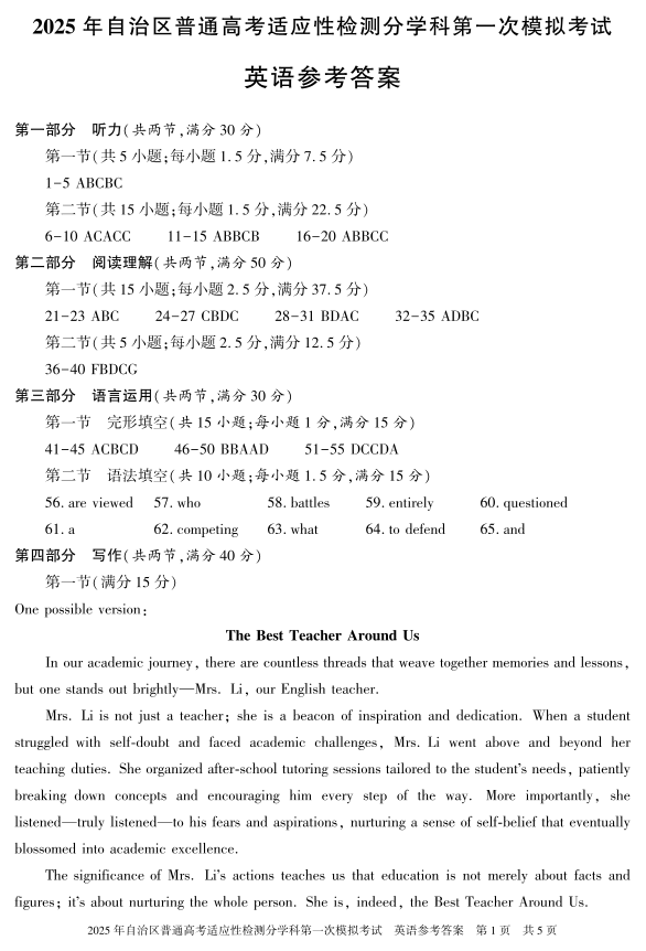 新疆维吾尔自治区普通高考适应性检测分学科第一次模拟考试英语答案