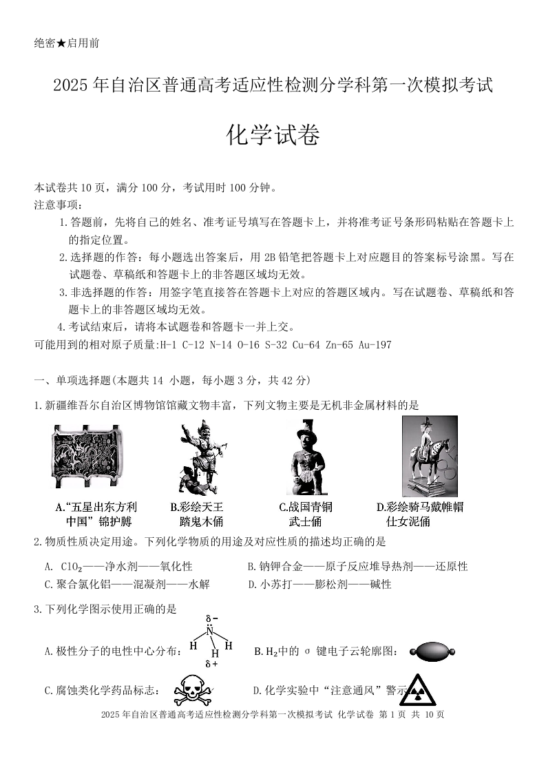 新疆维吾尔自治区普通高考适应性检测分学科第一次模拟考试化学