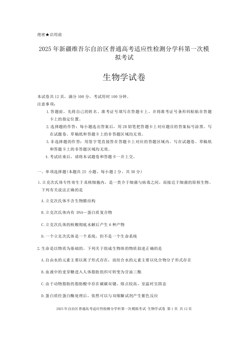 新疆维吾尔自治区普通高考适应性检测分学科第一次模拟考试生物