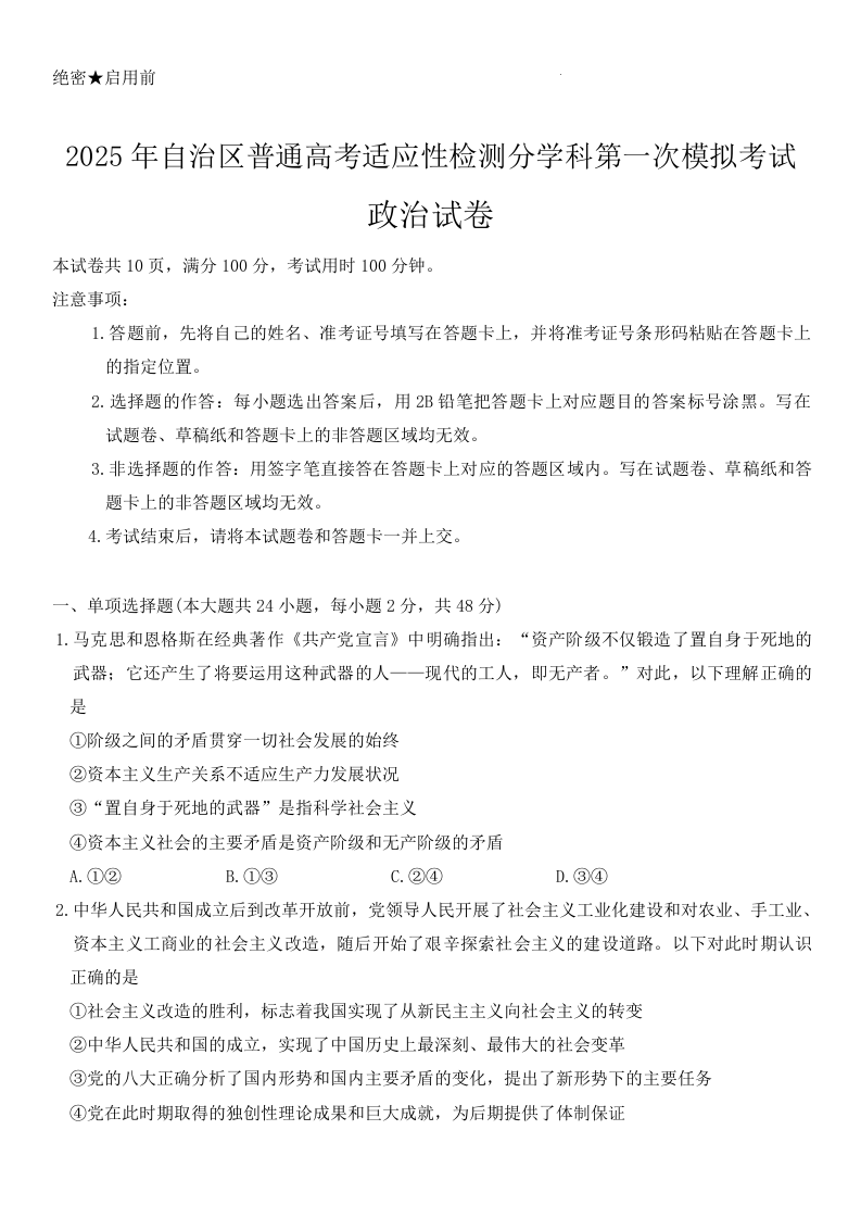新疆维吾尔自治区普通高考适应性检测分学科第一次模拟考试政治