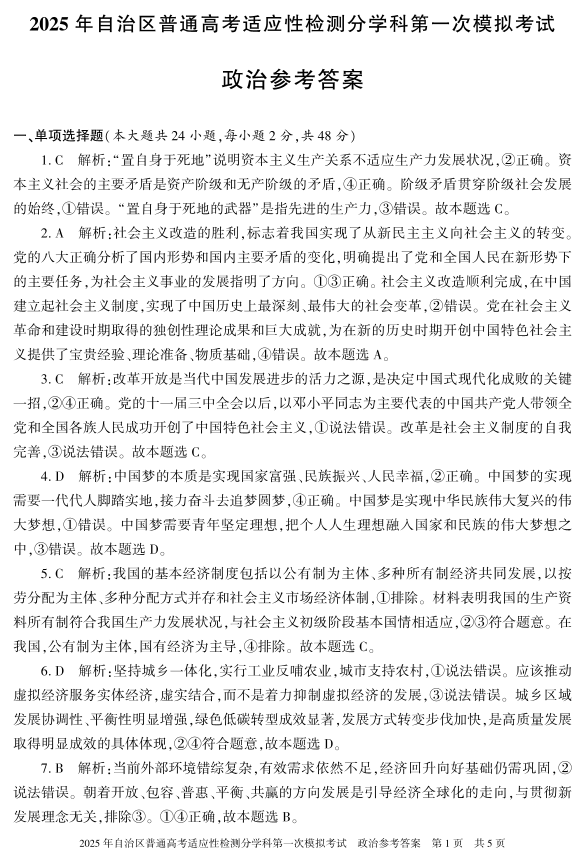新疆维吾尔自治区普通高考适应性检测分学科第一次模拟考试政治答案