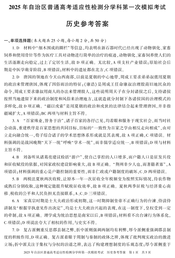 新疆维吾尔自治区普通高考适应性检测分学科第一次模拟考试历史答案