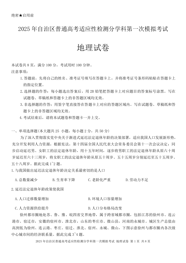 新疆维吾尔自治区普通高考适应性检测分学科第一次模拟考试地理