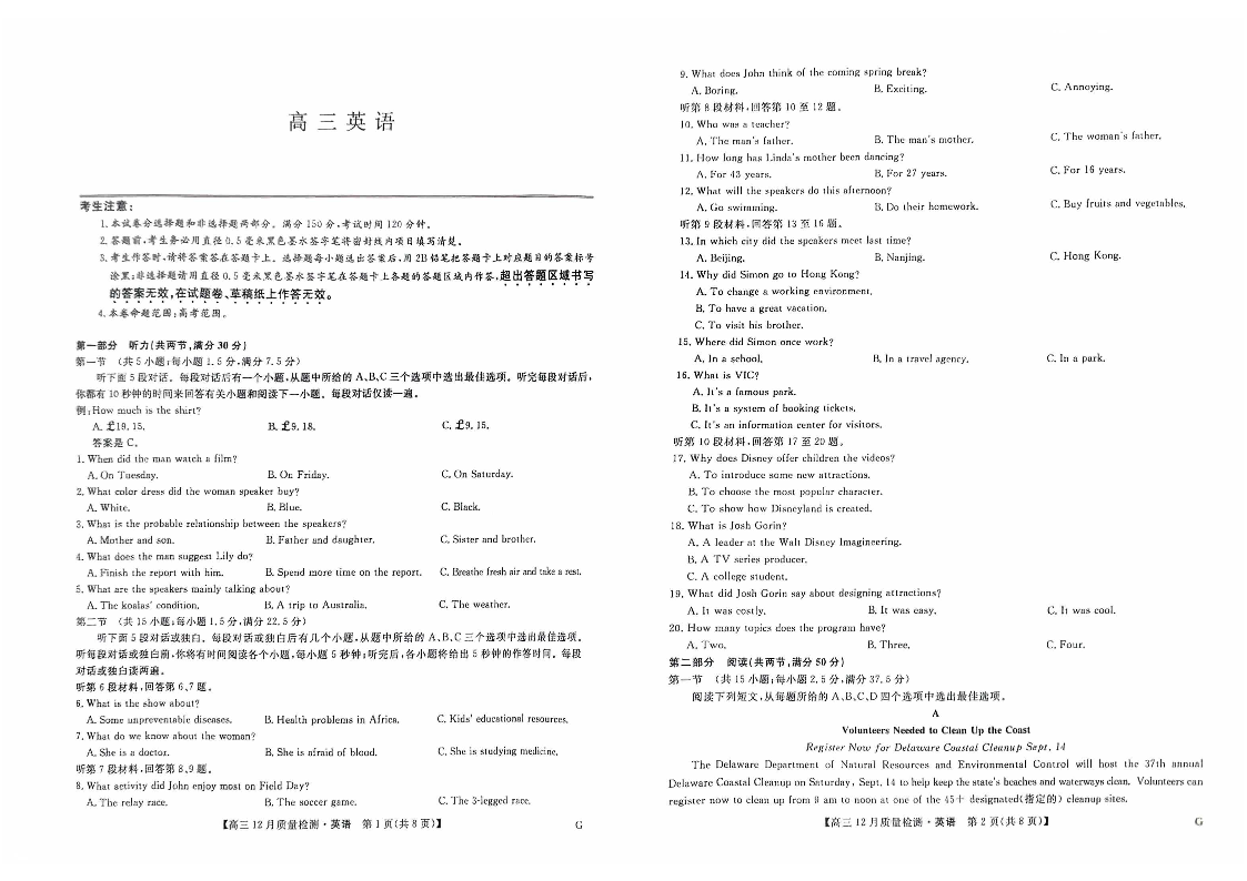 河南省部分高中2025届高三年级12月质量检测巩固英语