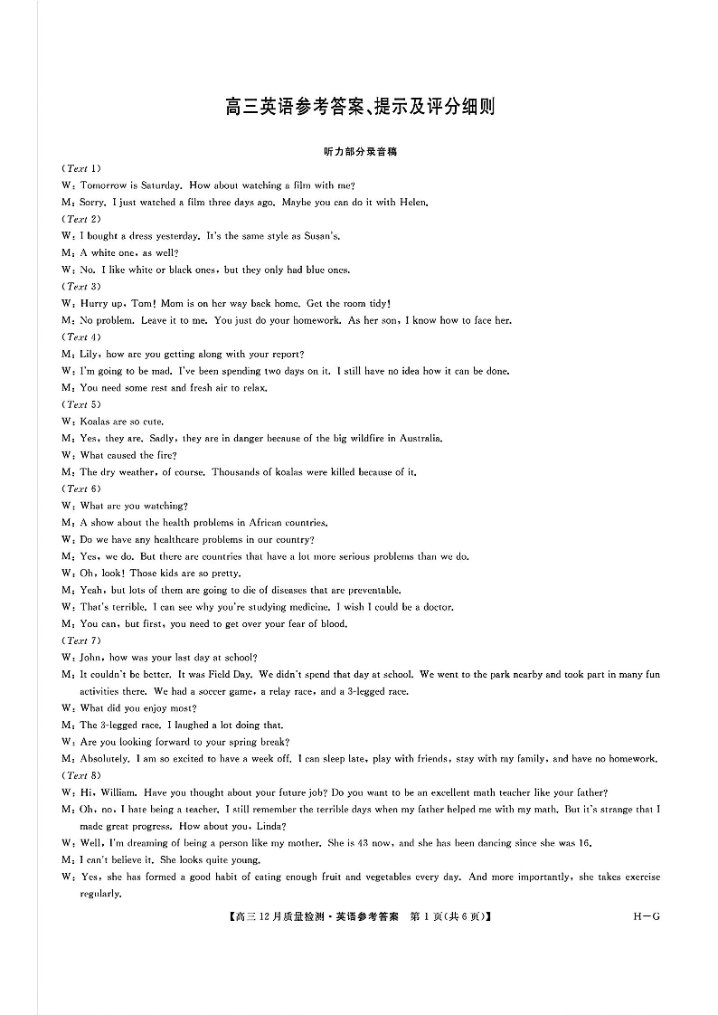 河南省部分高中2025届高三年级12月质量检测巩固英语答案