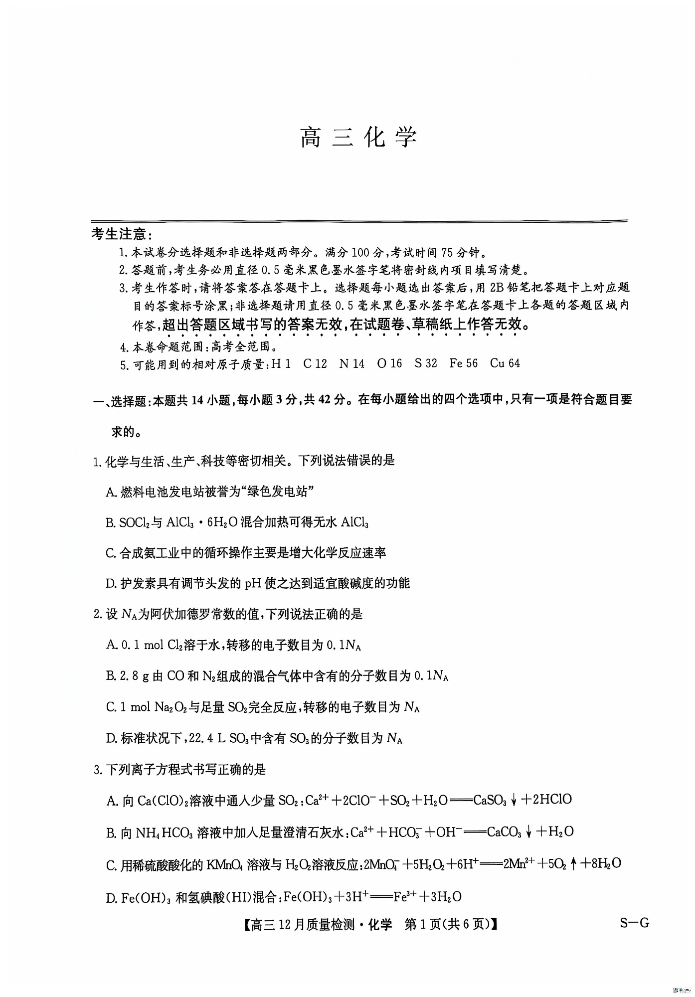 河南省部分高中2025届高三年级12月质量检测巩固化学