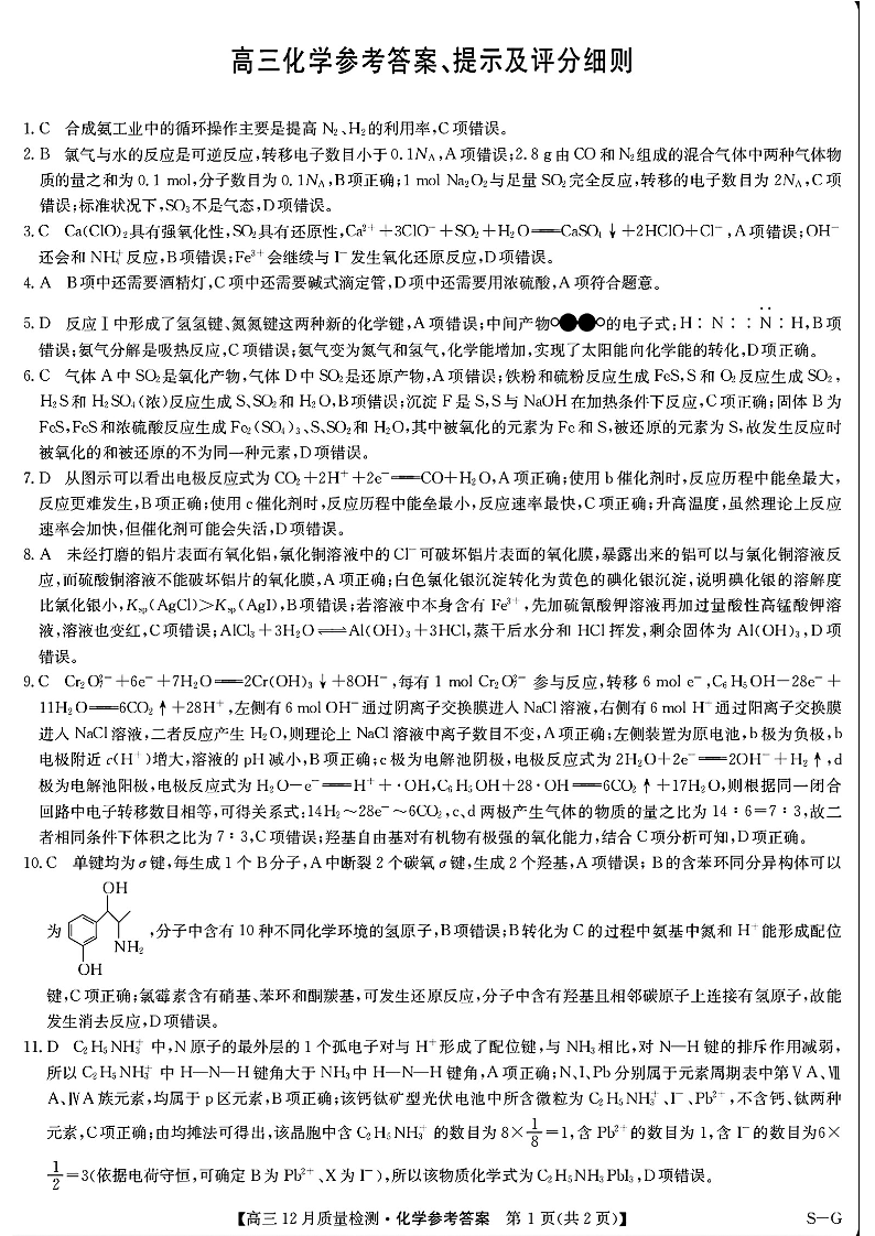河南省部分高中2025届高三年级12月质量检测巩固化学答案