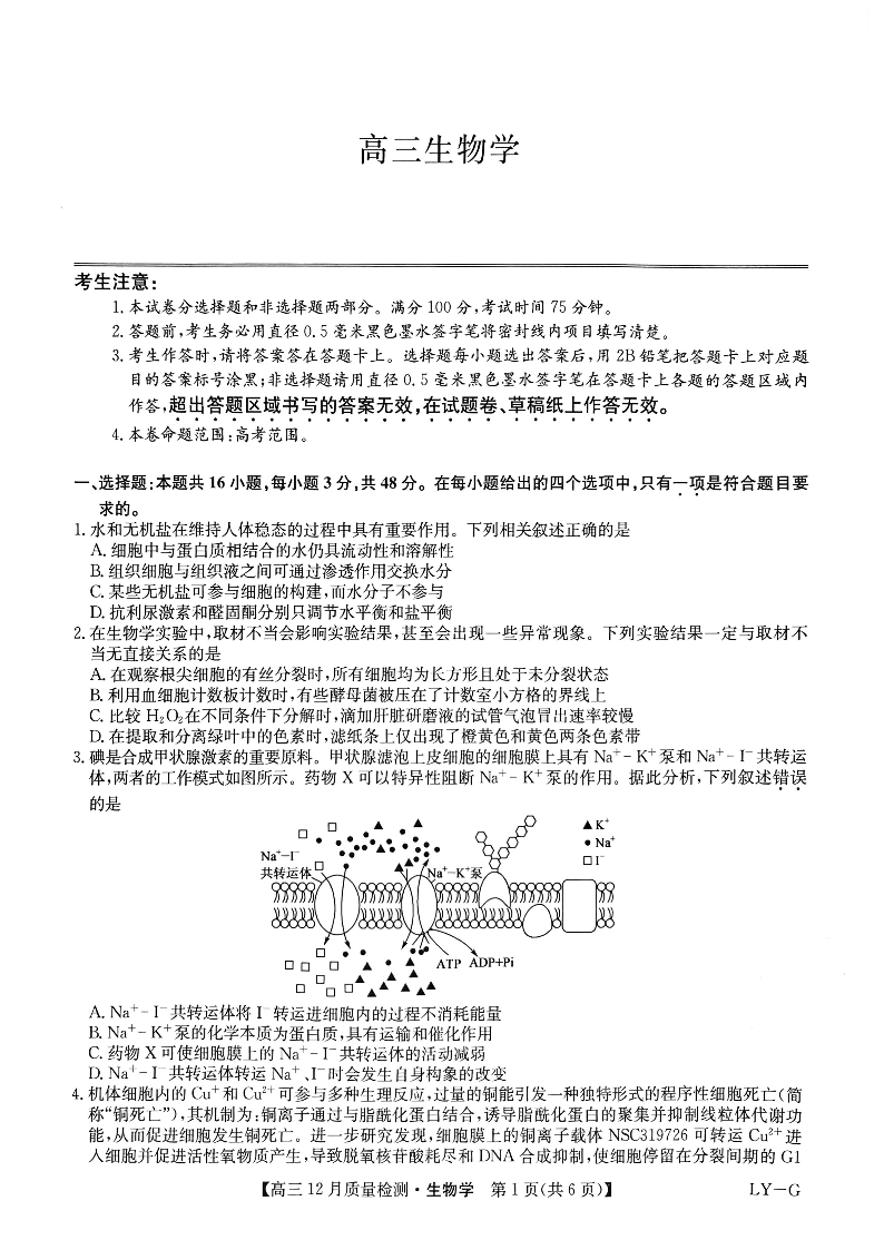 河南省部分高中2025届高三年级12月质量检测巩固生物