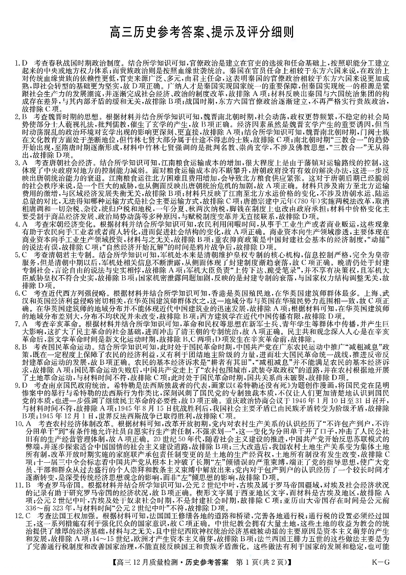 河南省部分高中2025届高三年级12月质量检测巩固历史答案