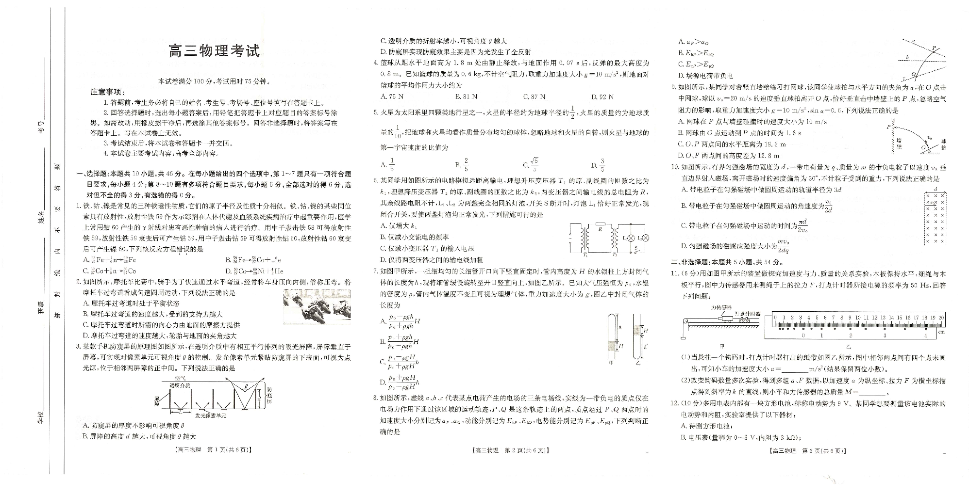 广西省区域高中2025届高三年级上学期12月联考物理
