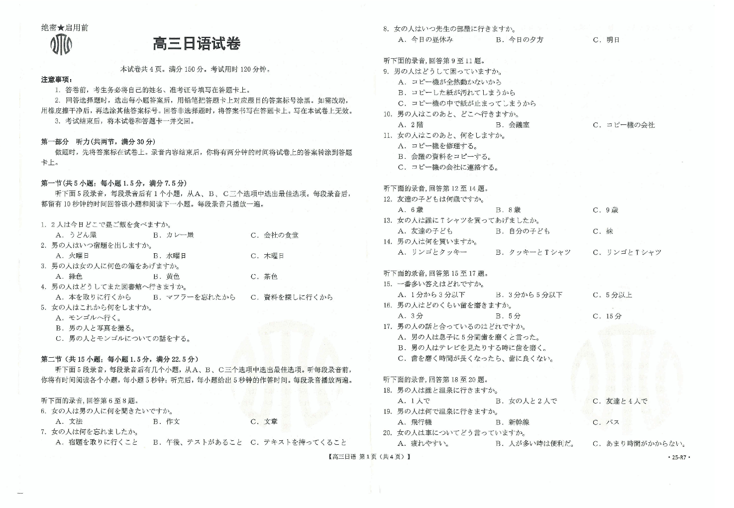 广西省区域高中2025届高三年级上学期12月联考日语
