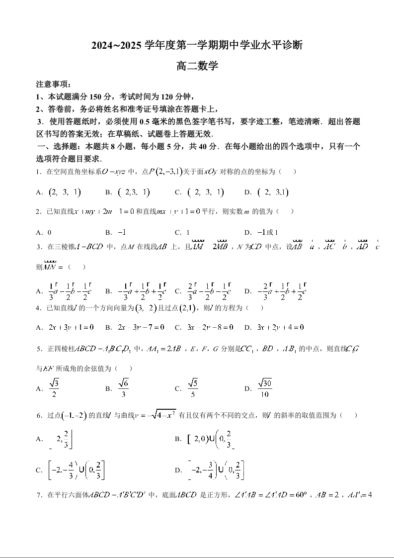 山东省烟台市2024-2025学年度第一学期期中学业水平诊断数学+答案