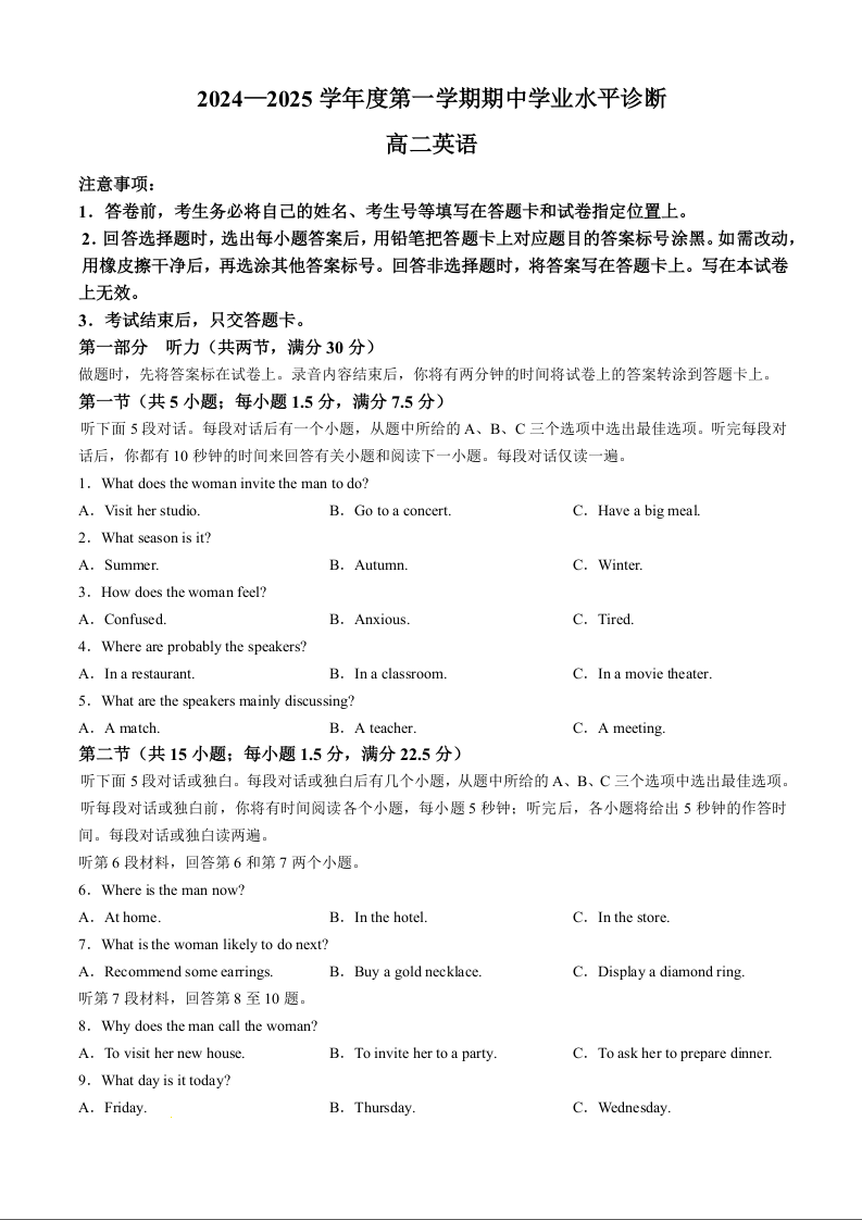 山东省烟台市2024-2025学年度第一学期期中学业水平诊断英语