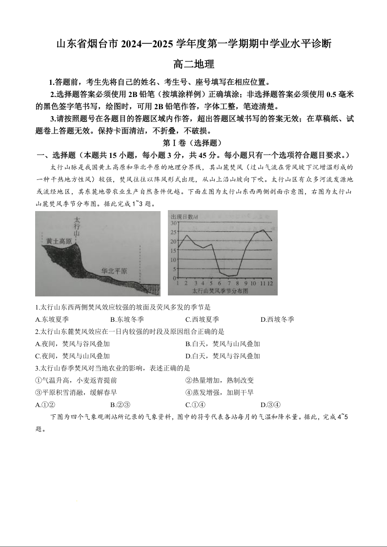 山东省烟台市2024-2025学年度第一学期期中学业水平诊断地理+答案