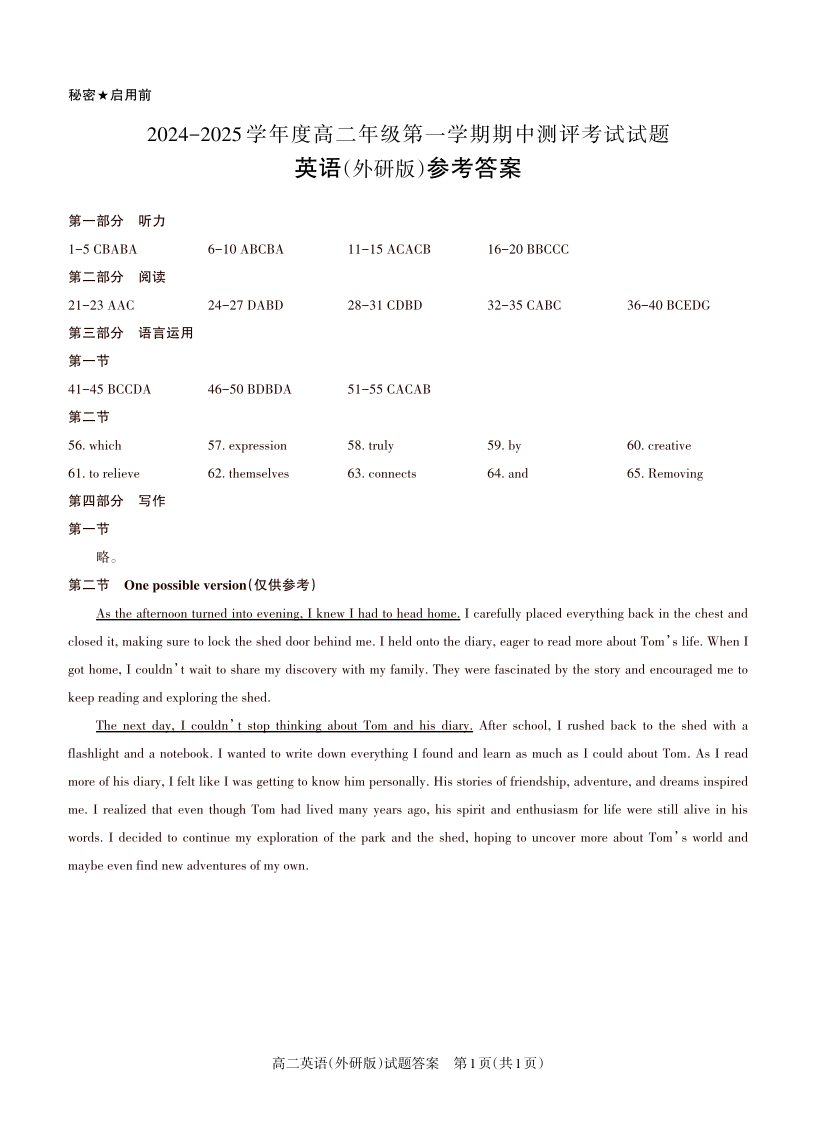 山西省部分学校2024-2025学年度高二年级第一学期期中测评考试英语答案(外研)