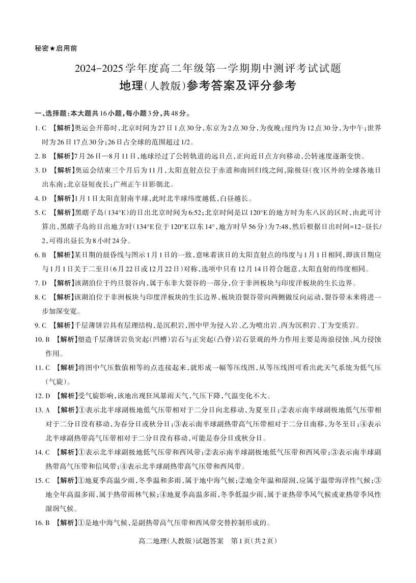 山西省部分学校2024-2025学年度高二年级第一学期期中测评考试地理答案(人教)