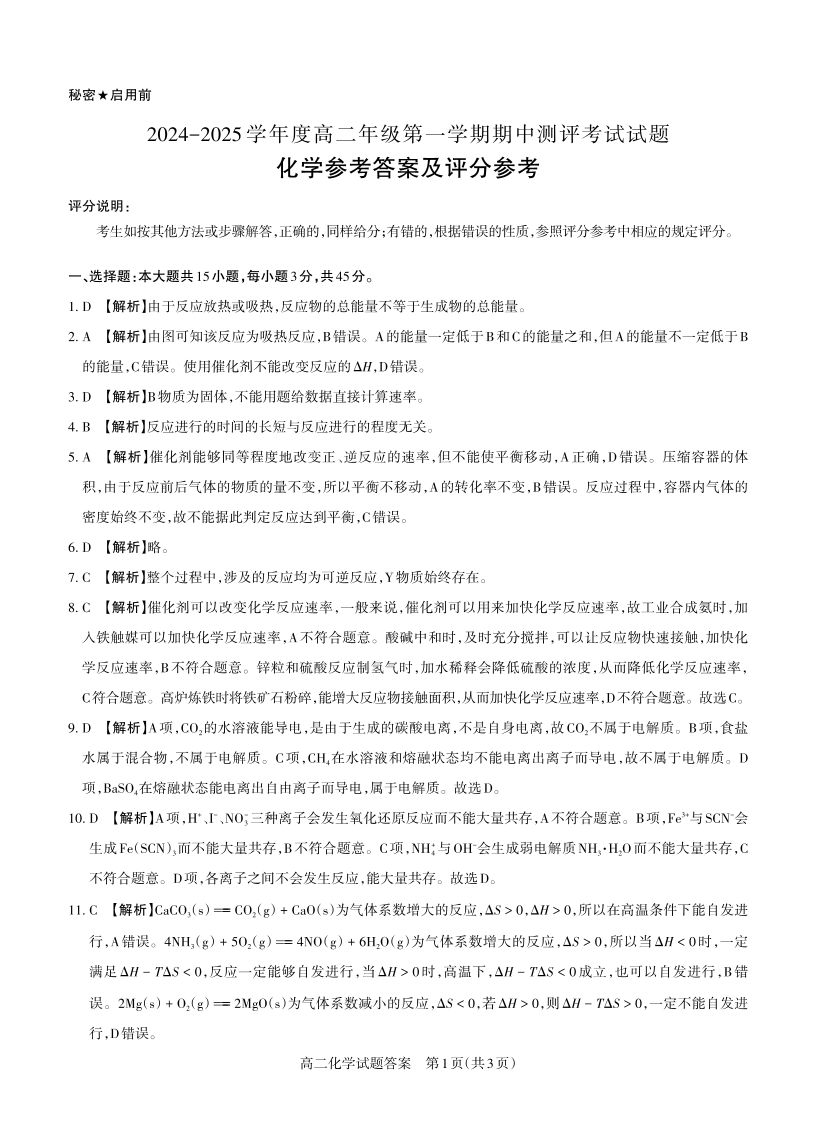 山西省部分学校2024-2025学年度高二年级第一学期期中测评考试化学答案