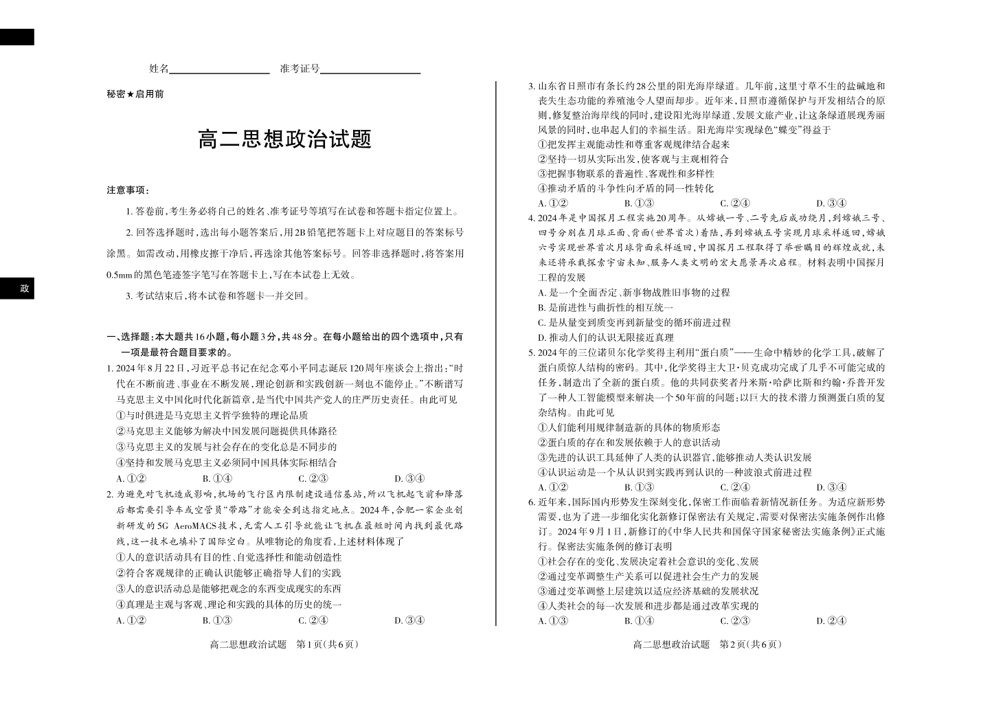 山西省部分学校2024-2025学年度高二年级第一学期期中测评考试政治