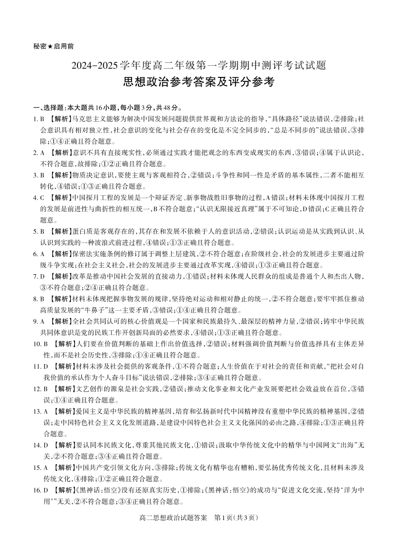 山西省部分学校2024-2025学年度高二年级第一学期期中测评考试政治答案