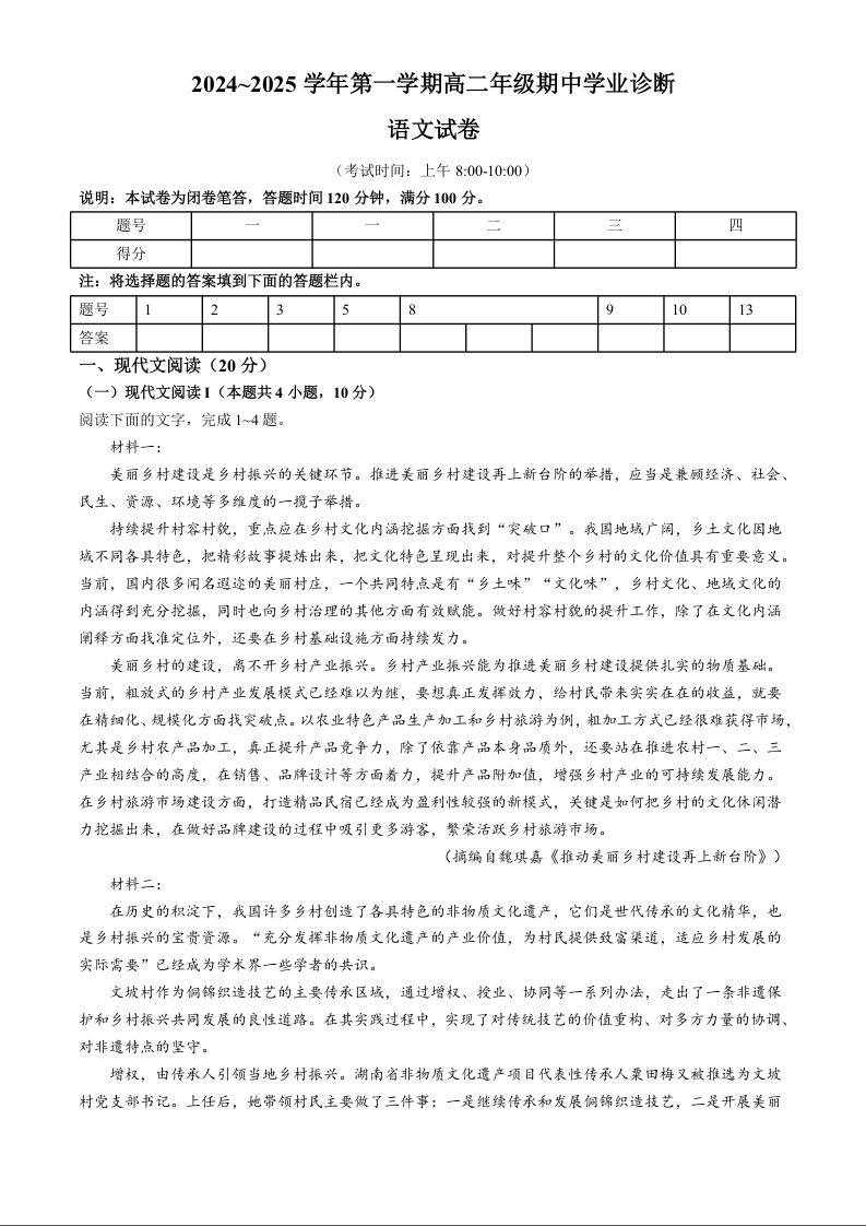 山西省太原市2024-2025学年第一学期高二年级期中学业诊断语文+答案