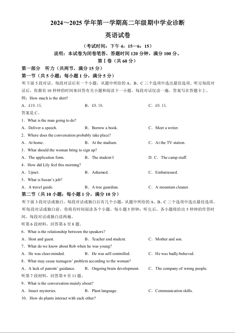 山西省太原市2024-2025学年第一学期高二年级期中学业诊断英语+答案