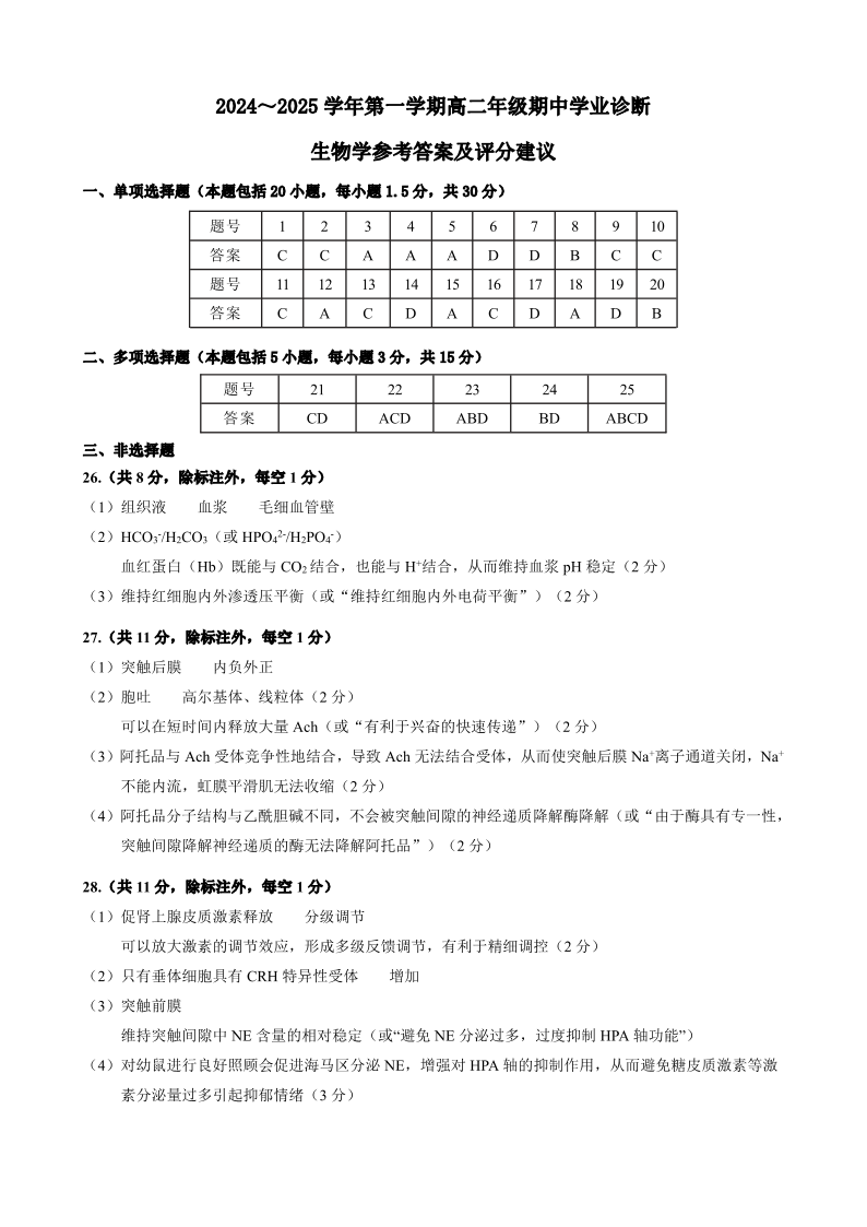 山西省太原市2024-2025学年第一学期高二年级期中学业诊断生物答案