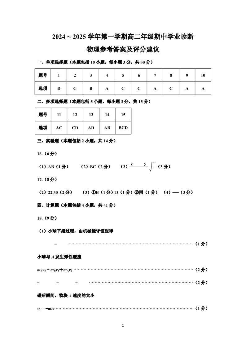 山西省太原市2024-2025学年第一学期高二年级期中学业诊断物理答案
