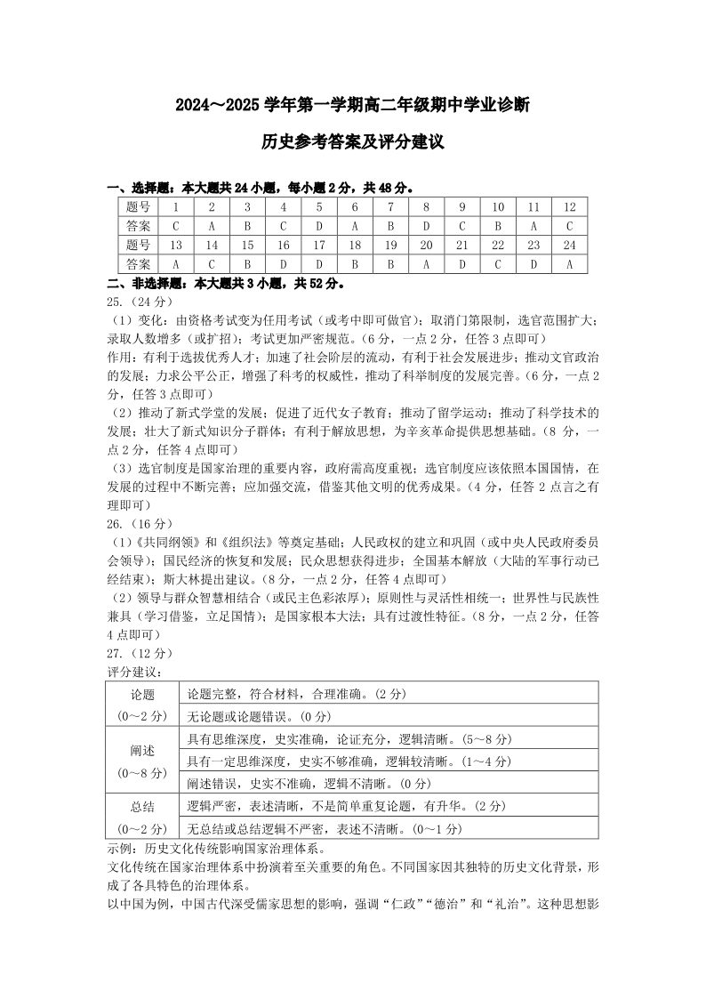 山西省太原市2024-2025学年第一学期高二年级期中学业诊断历史答案