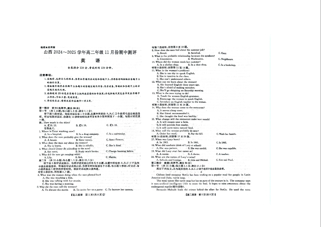 山西省运城市2024-2025学年高二年级11月份期中测评英语