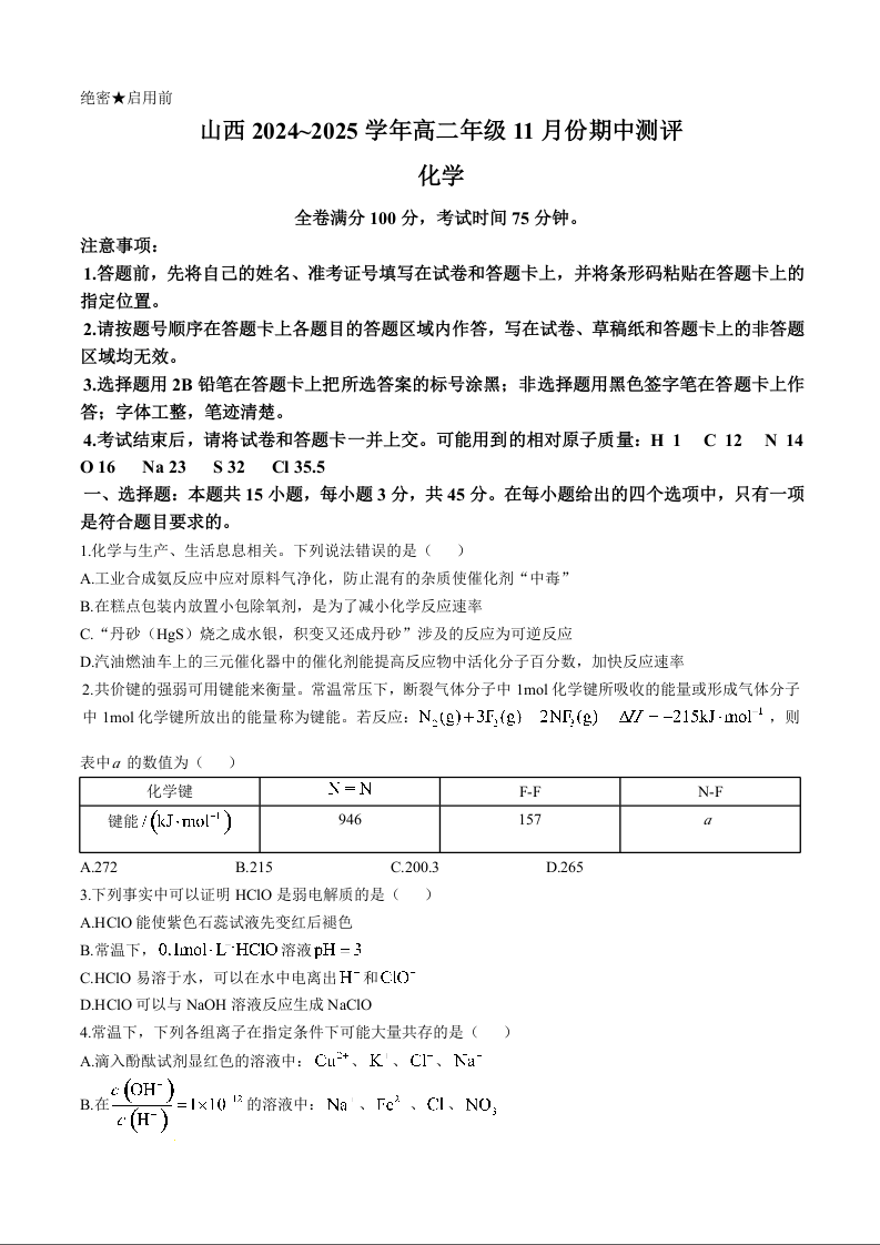 山西省运城市2024-2025学年高二年级11月份期中测评化学+答案