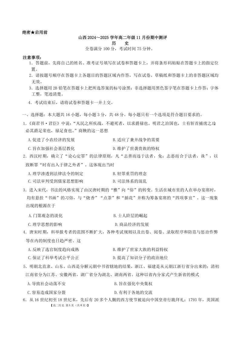 山西省运城市2024-2025学年高二年级11月份期中测评历史+答案