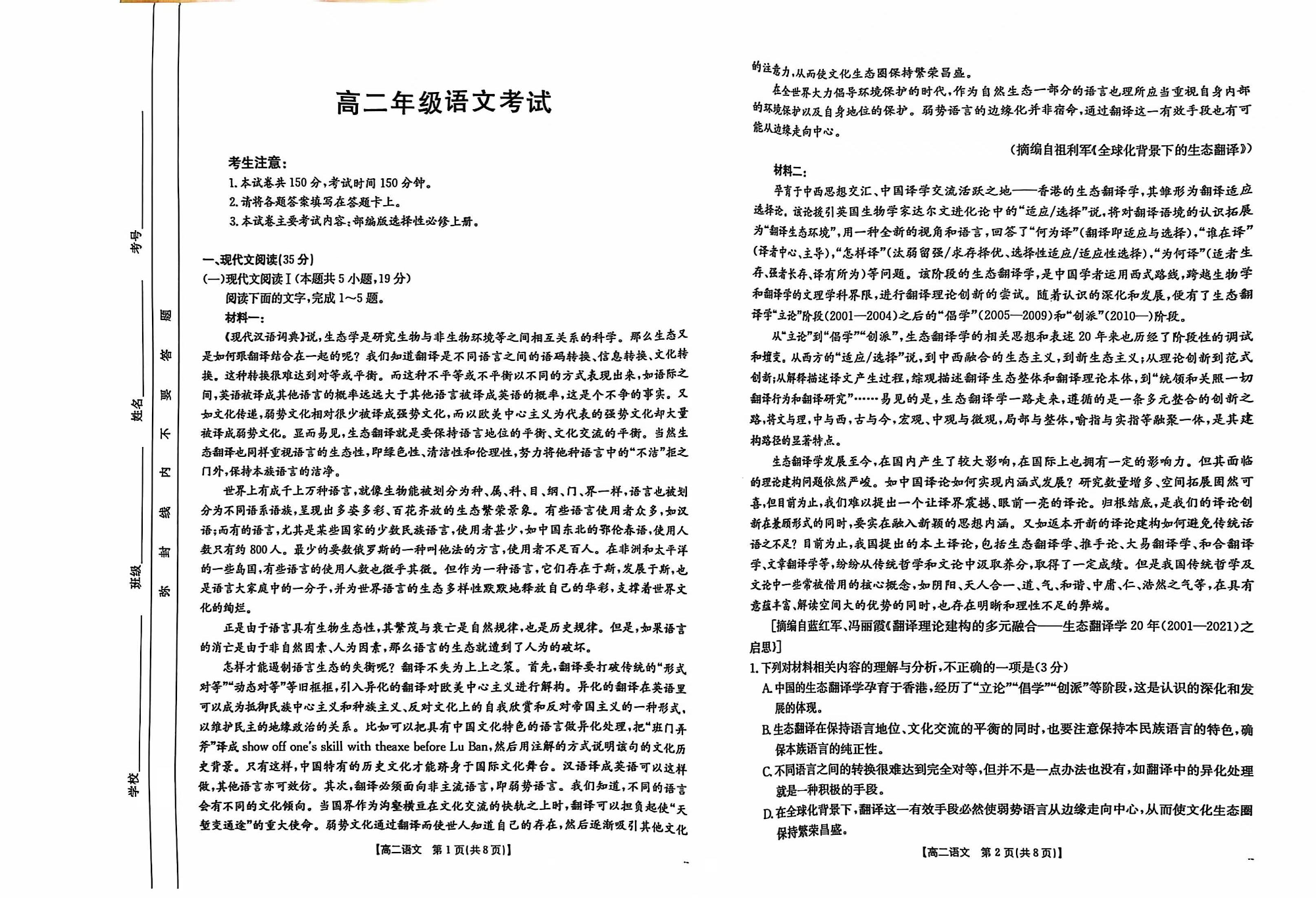 陕西省部分学校2024-2025学年高二11月期中考试语文