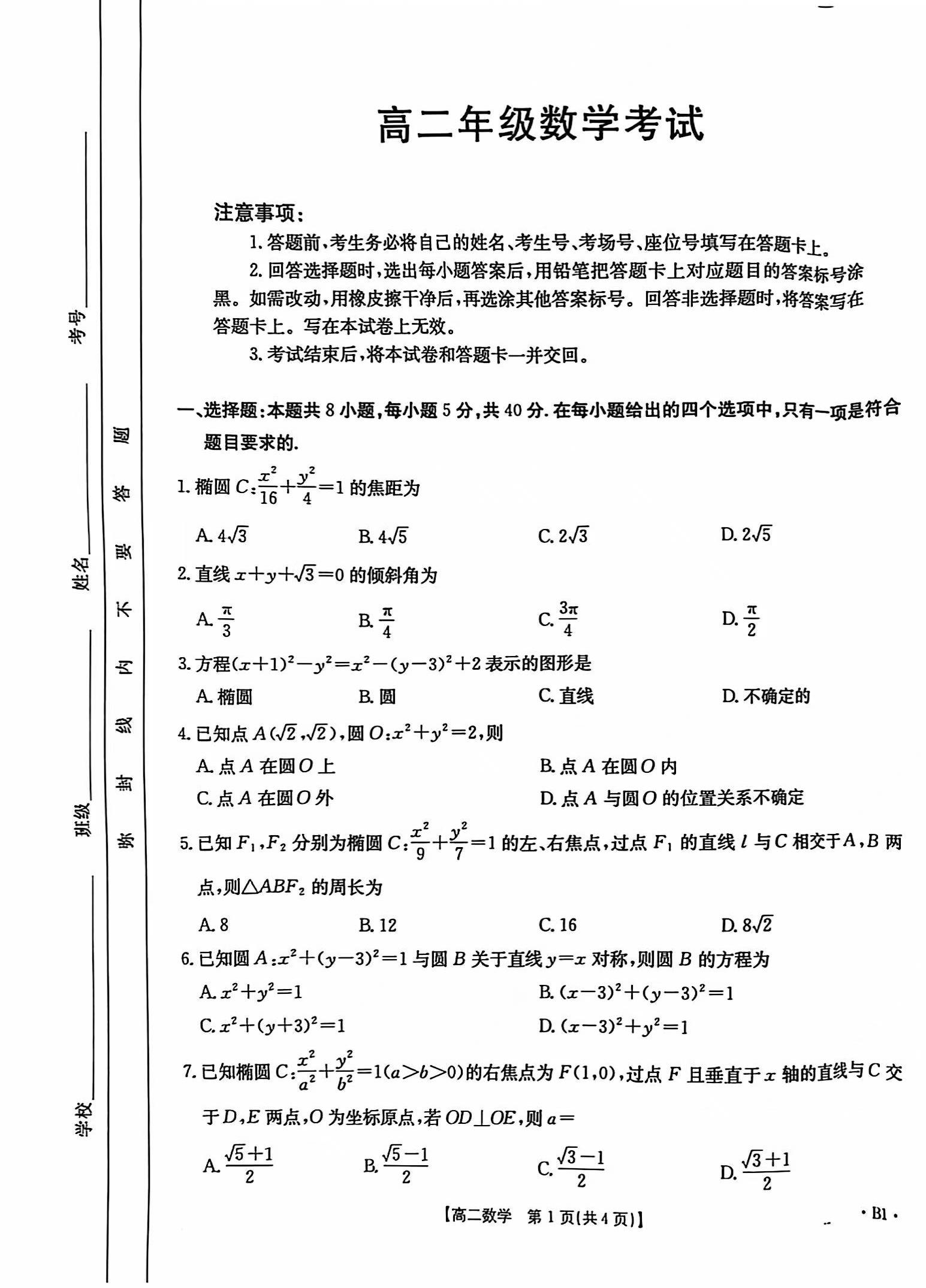 陕西省部分学校2024-2025学年高二11月期中考试数学