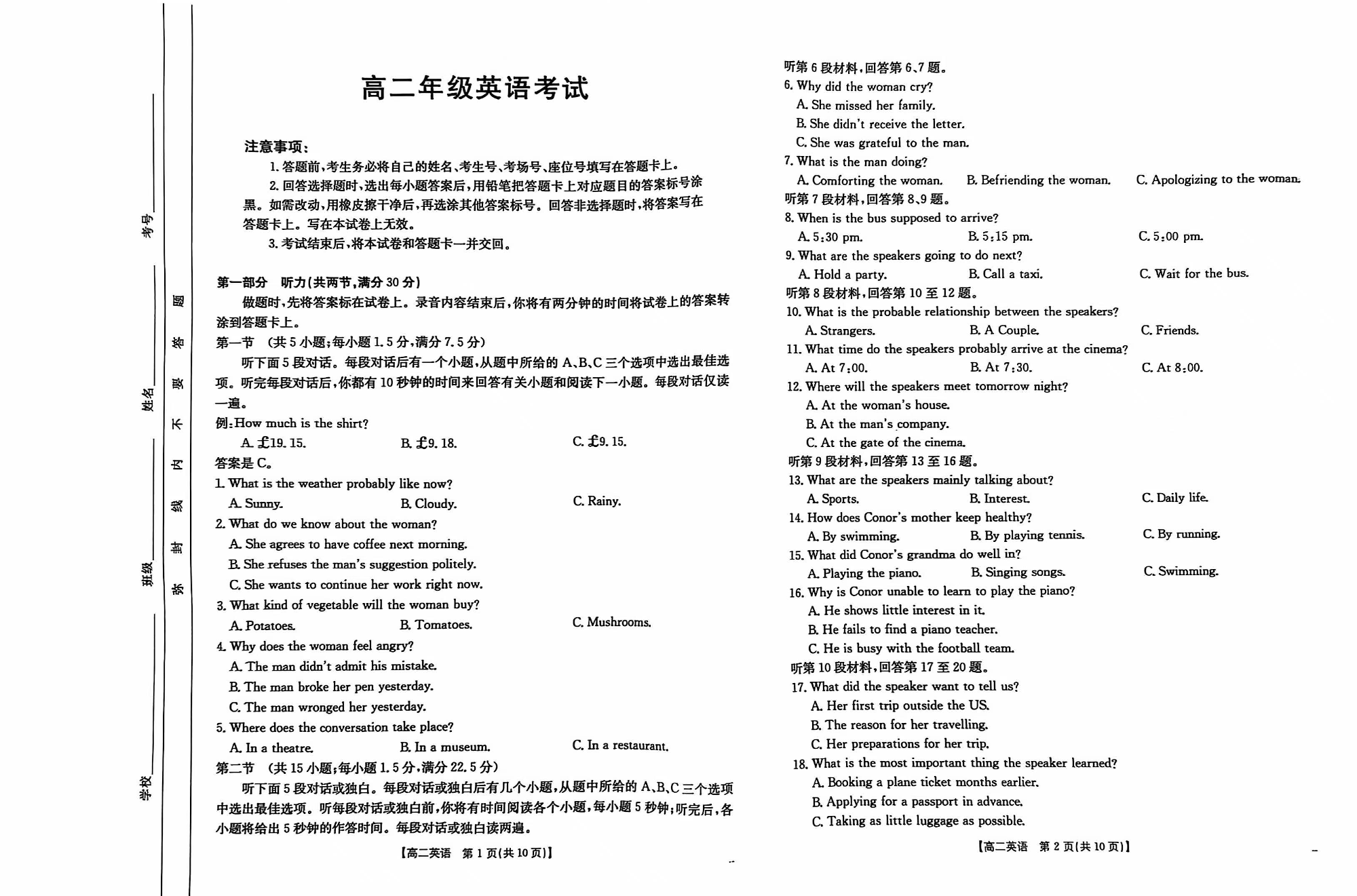 陕西省部分学校2024-2025学年高二11月期中考试英语