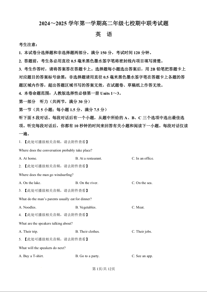 陕西省榆林市2024-2025学年第一学期高二年级七校期中联考试题英语试题(原卷版)